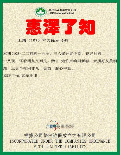 【惠泽了知】108期:二二有机一五至,三六爆开定今期,解22鸡,15龙,36羊。花好月圆一八现,还看四九又回头。解夜肖鼠牛虎鸡狗猪。18牛,49马。赠言:炮竹声响闹新春,亲朋好友美酒纯,三更半夜闹非凡,美酒下腹心中温